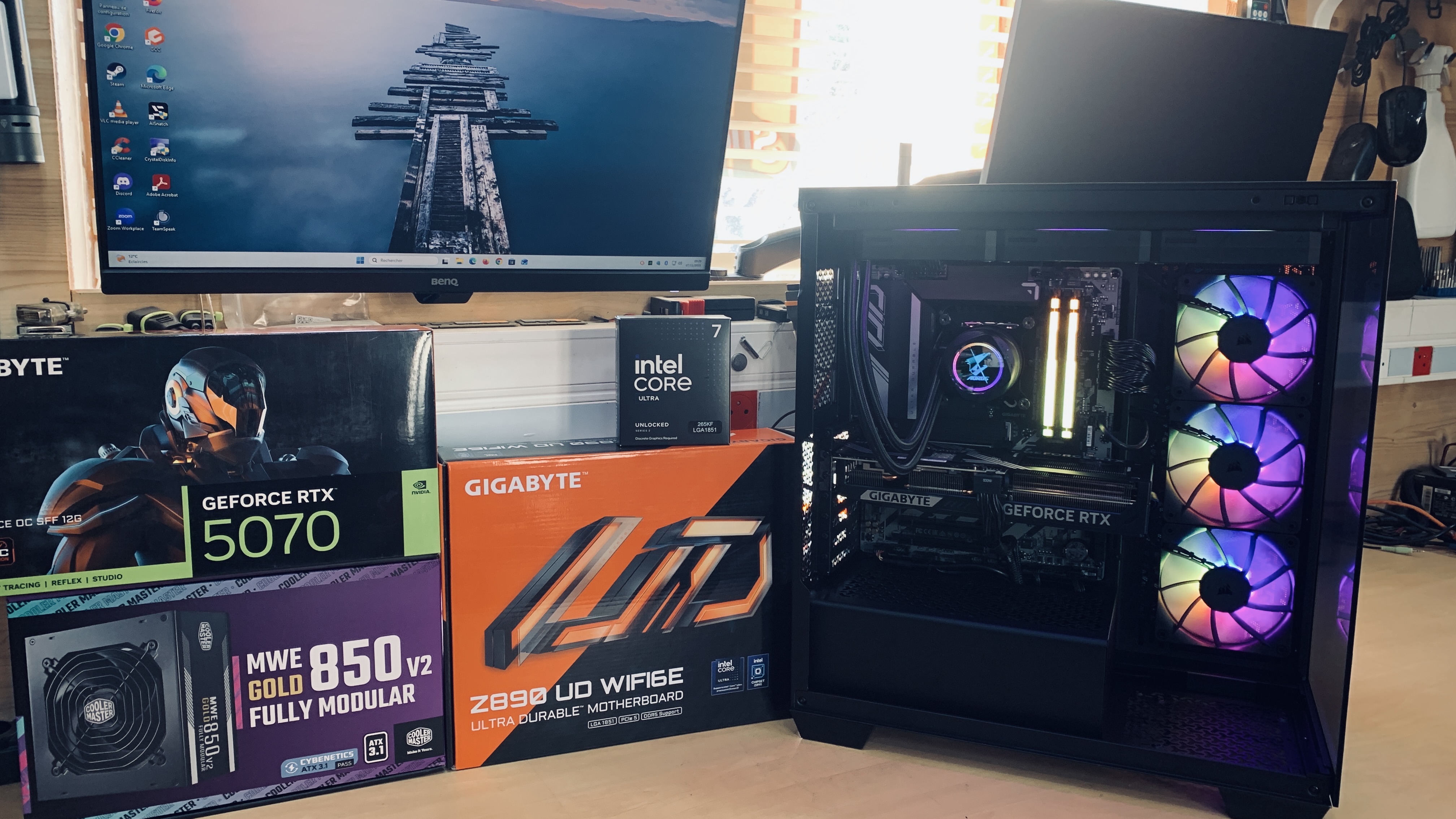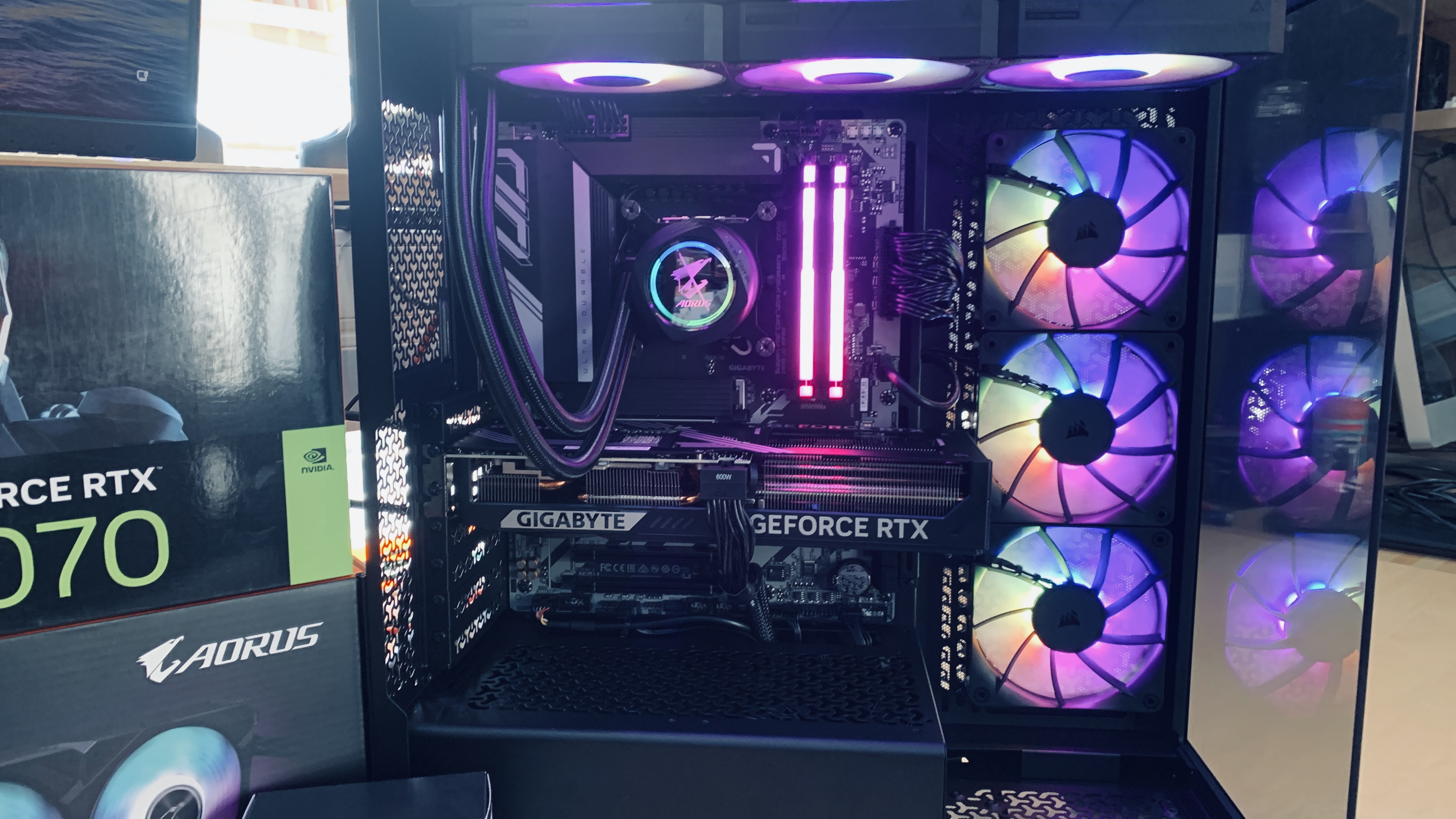 Après examen de la puissance nécessaire, du stockage et du choix des divers composants, le voici fin prêt pour rejoindre son propriétaire : processeur intel CORE 7 ULTRA 265KF, refroidissement liquide AORUS, 64Gb de mémoire vive DDR5, carte graphique GEFORCE RTX 5070, stockage SSD NVMe Gen5. Le tout avec des ventilateurs RGB entièrement personnalisables et synchronisés.